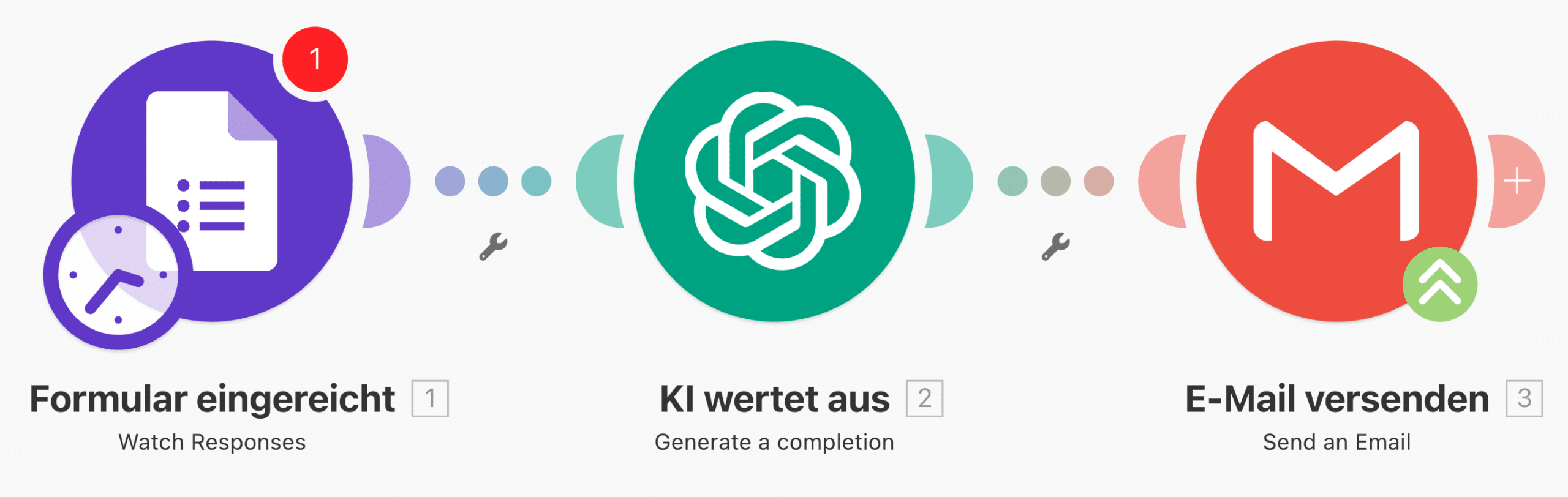 Hier eine kleine Automation, die Formular-Antworten mit KI auswertet und E-Mails sendet: