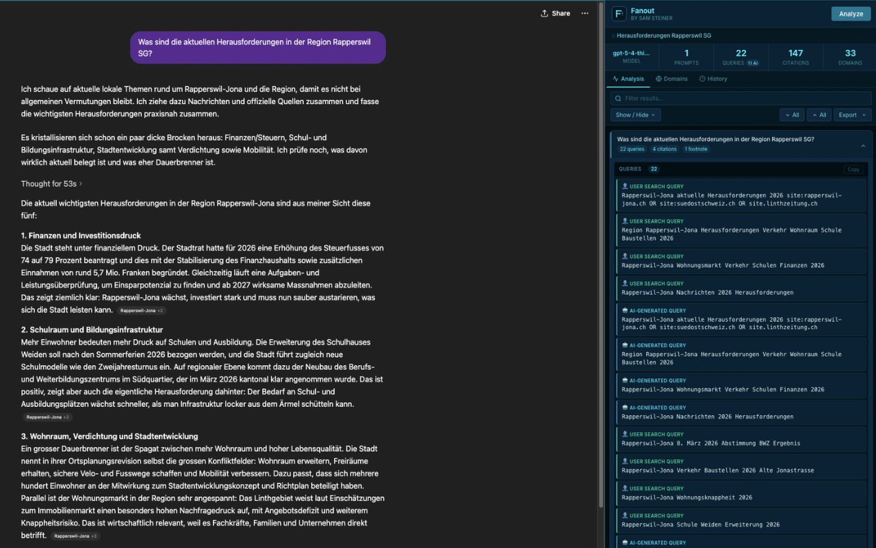When ChatGPT answers a question, it doesn’t search for what you typed — it generates a cluster of sub-queries behind the scenes. Fanout makes that cluster visible, which is valuable for anyone trying to understand how AI models source and rank information.
